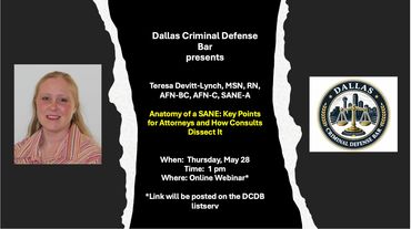 May 28 at 1 pm - Nurse Teresa Devitt-Lynch on Anatomy of a SANE for Attorneys and How Consults Dissect It